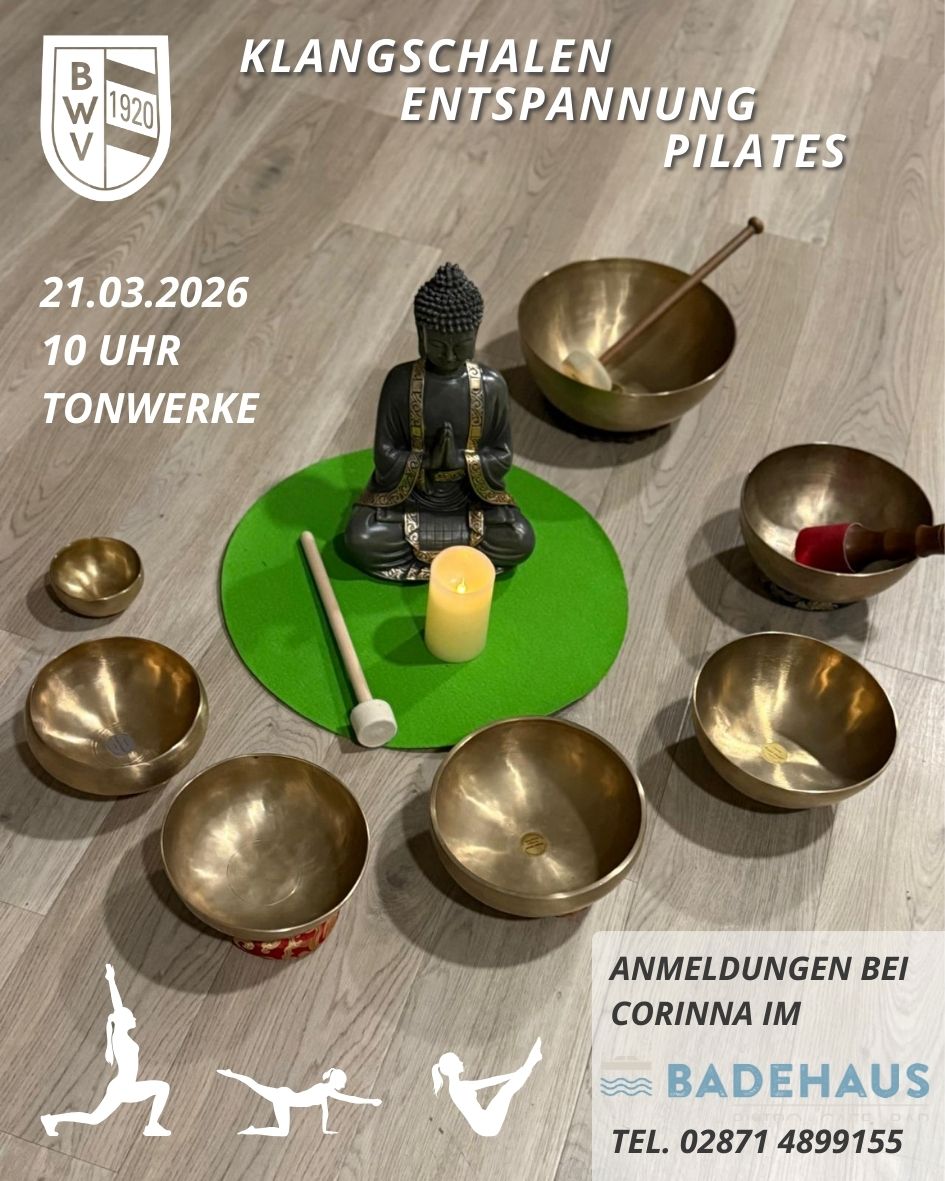 Unsere Breitensportwartin Nicola lädt zur Klangschalenentspannung und Pilates in den Jugendraum ein. Anschließend folgt ein gemütliches Beisammensein im Badehaus mit einem gesunden Essen. Start ist um 10 Uhr im Jugendraum. Anmeldungen sind bei Corinna im Badehaus möglich (Mail: